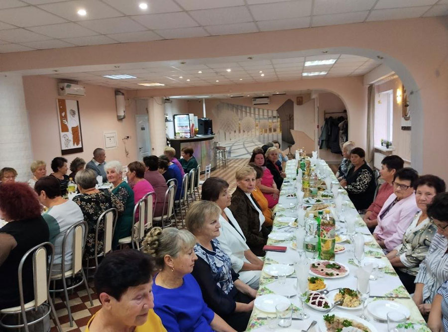 Всего в зале кафе собрались не более не менее 65 человек - ветераны труда, пенсионеры и те, кто еще продолжает трудиться в нашем учреждении. Встреча уже стала традиционной, проводится не первый год. И всегда собирает полный зал.