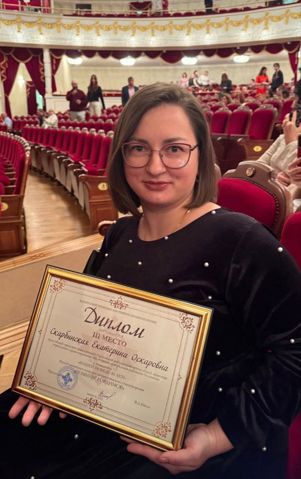 20 ноября в Большом театре Беларуси состоялась торжественная церемония награждения лауреатов Республиканского конкурса патриотического стихотворения «Помним! Гордимся!», организованного Белорусским профсоюзом работников здравоохранения. Более 700 авторов-любителей поэзии из числа работников отрасли направили свои литературные произведения на суд профессионального жюри. В числе конкурсантов была и наш врач общей практики (заведующий) Песковской АОП Скарбинская Екатерина Оскаровна.