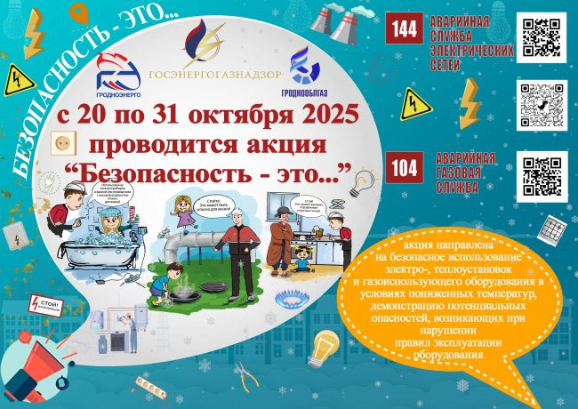 В период с 20 по 31 октября 2025 года проводится акция «Безопасность — это...», направленная на безопасное использование электро-, теплоустановок и газоиспользующего оборудования в осенне-зимний период,