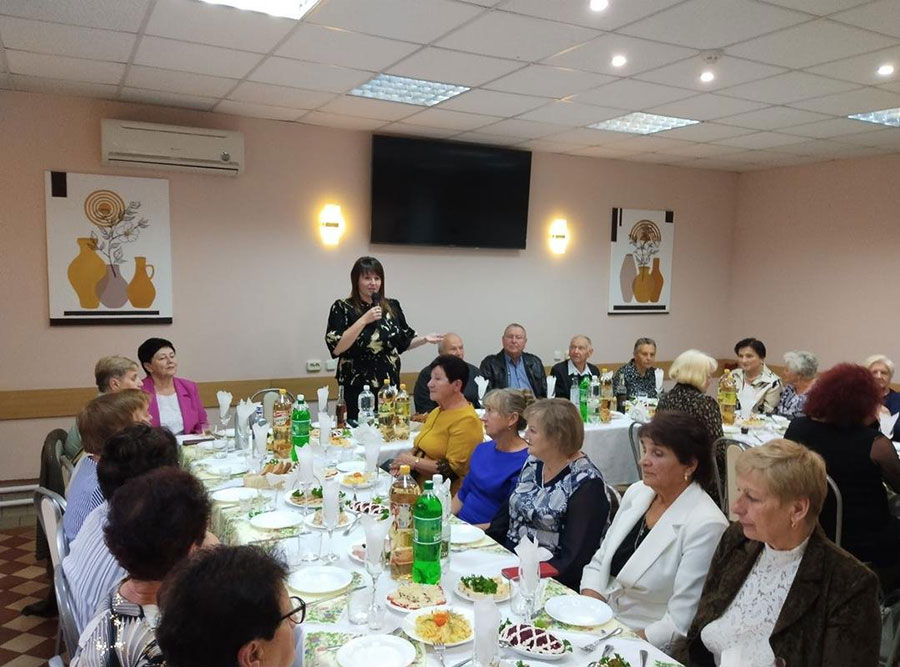 Всего в зале кафе собрались не более не менее 65 человек - ветераны труда, пенсионеры и те, кто еще продолжает трудиться в нашем учреждении. Встреча уже стала традиционной, проводится не первый год. И всегда собирает полный зал.