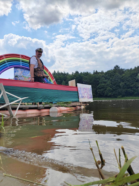 Корабль "Мирный", во главе с капитаном, председателем профкома Владимиром Жаком, открыл состязания в конкурсе плавучих средств в заплыве "На чем попало". Смастерили корабль вместе с коллегами из подручных материалов. Корпус судна оформили в цветах национального флага, на палубе установили радугу и посвятили заплыв Году мира и созидания.