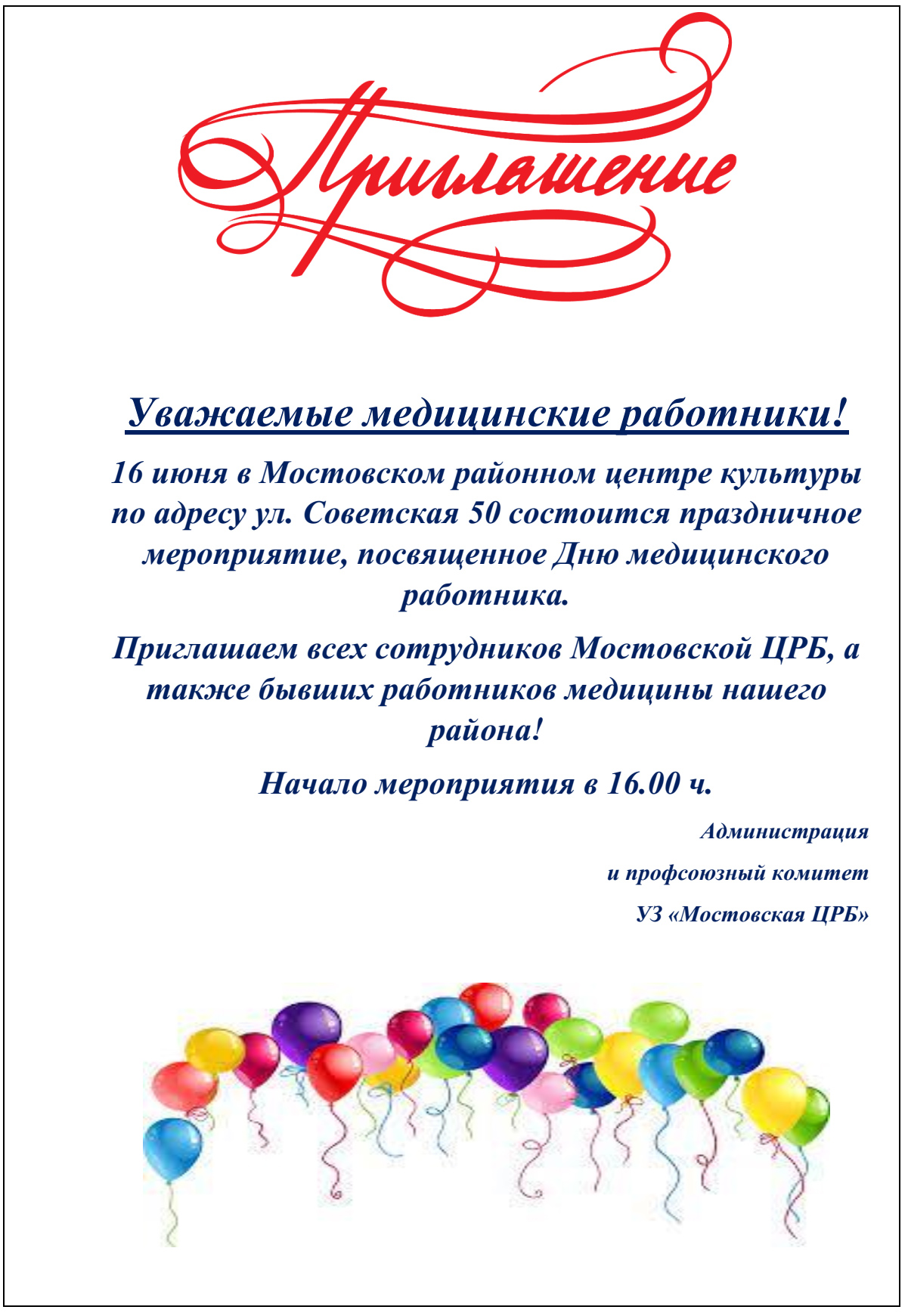 Приглашаем всех сотрудников Мостовской ЦРБ, а также бывших работников медицины нашего района!